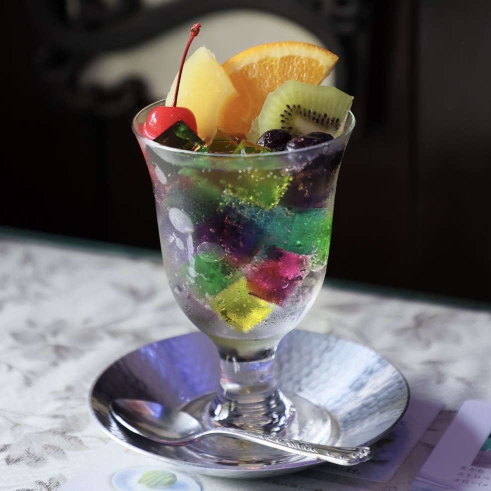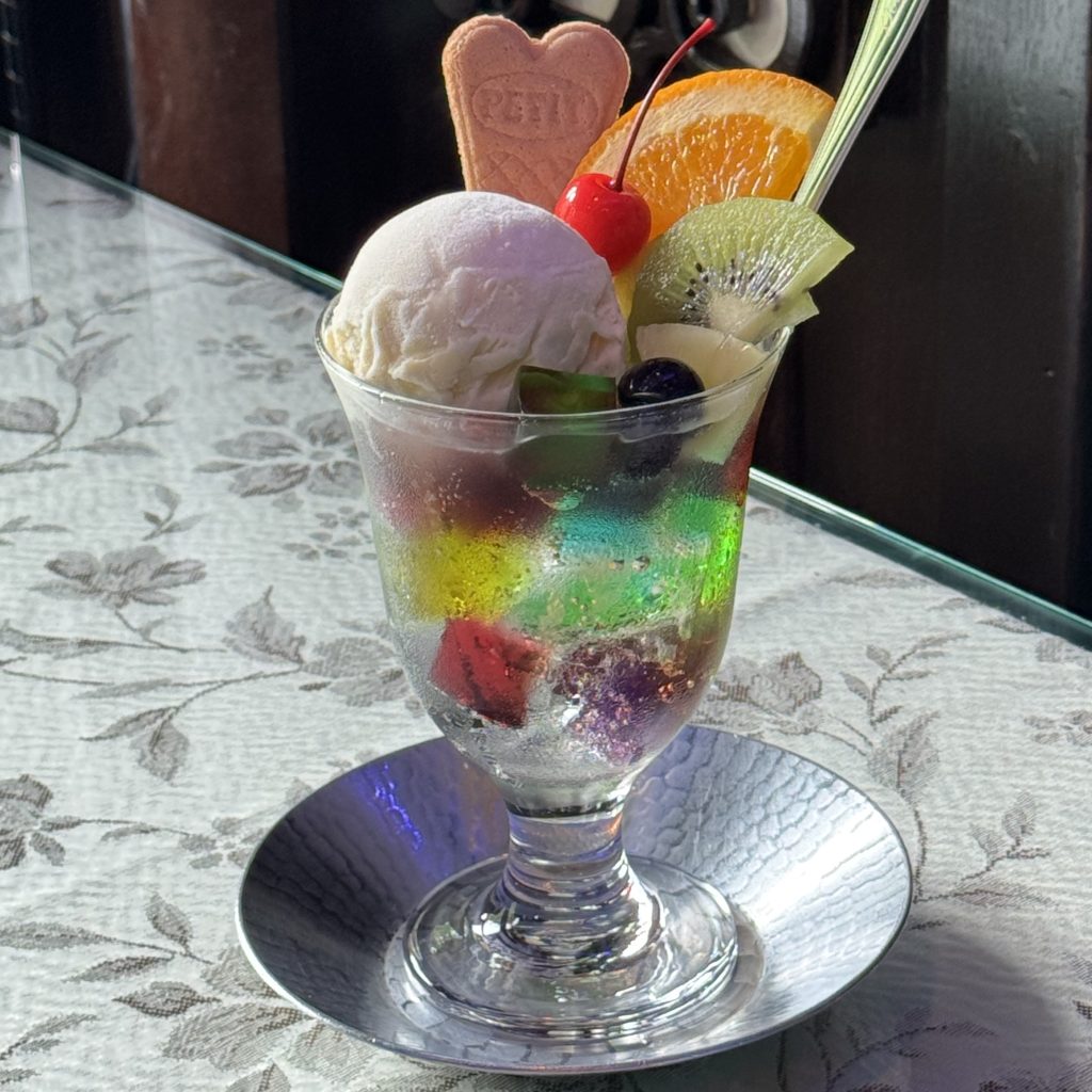 本店でご提供中のゼリーポンチフロートとは、トッピング内容が異なります。オレンジ・キウイ・パイン・ブルーベリー・チェリーのフルーツ5種類に加え、アイスクリームとウエハースを盛り付けました🍒