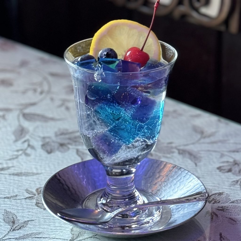 本店では年に数回、期間限定でご提供させていただくメニューです。夜会をイメージした青系の5色のゼリーを使用し、レモン・ブルーベリー・チェリーをトッピングしております💎