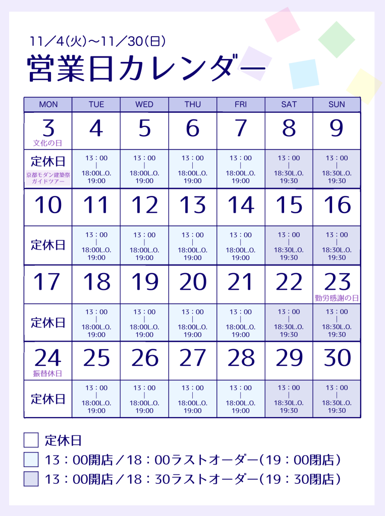 【📆11/4(火)~11/30(日)営業カレンダーを更新しました】
