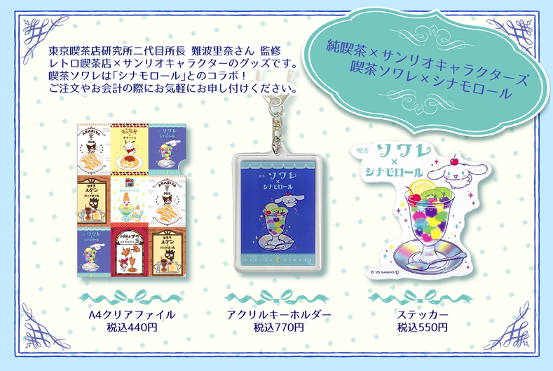 現在、東京喫茶店研究所二代目所長 難波里奈さん監修『純喫茶×サンリオキャラクターズ』のコラボ商品3点を、店内にて販売しております。