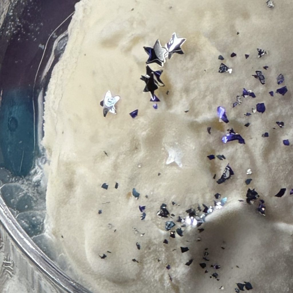 店名である「ソワレ(フランス語で夜会)」をイメージした青色の5色ゼリーにソーダを注ぎ、バニラアイスの上には銀の星を散りばめました🌠