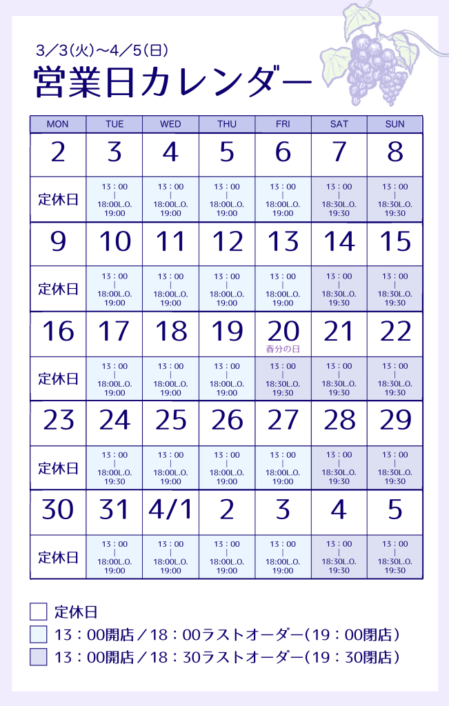【📆3/3(火)~4/5(日)営業カレンダーを更新しました】